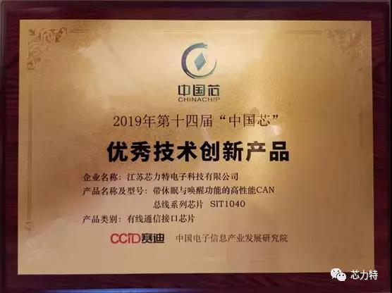 2019年10月25日,“中國芯”第十四屆集成電路產業促進大會在青島舉行。在會上公布了“中國芯”優秀產品征集的結果。芯力特有線通信接口芯片:帶休眠與喚醒功能的高性能CAN總線芯片SIT1040,榮獲“優秀技術創新產品”,是本次“中國芯”大獎評比在有線通信接口領域僅有的1顆獲獎芯片!