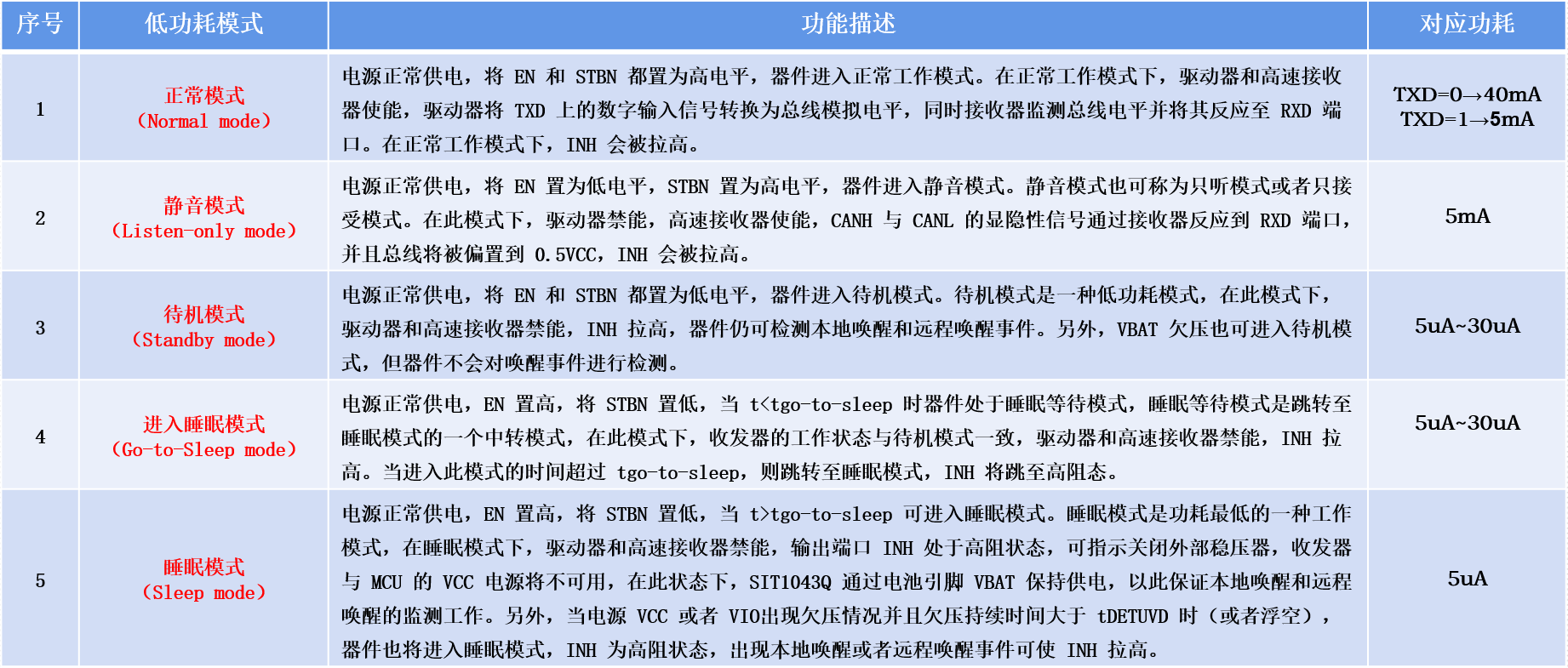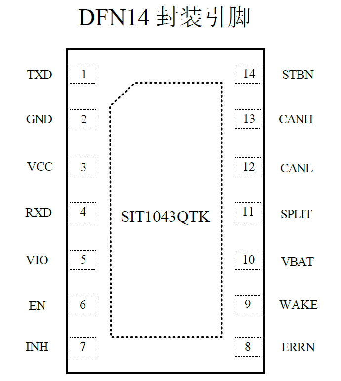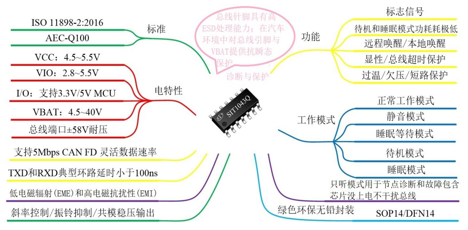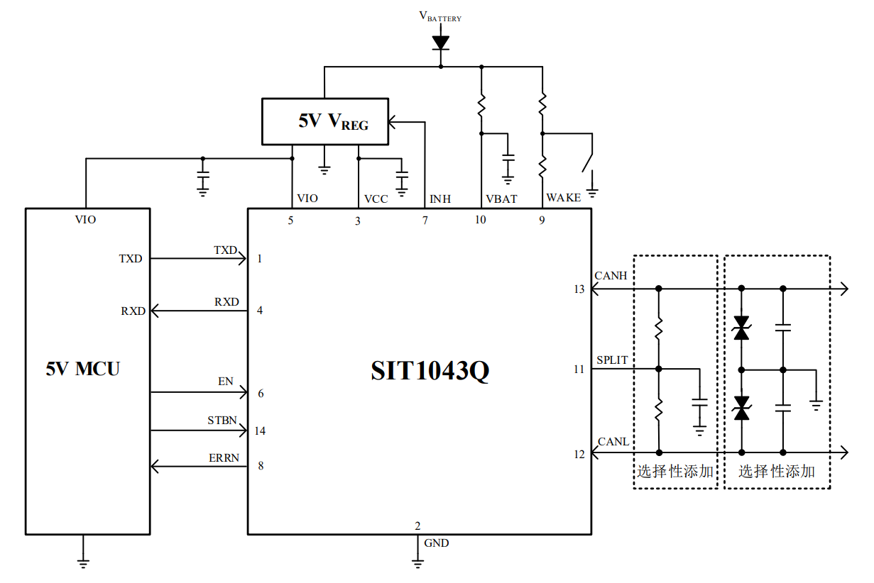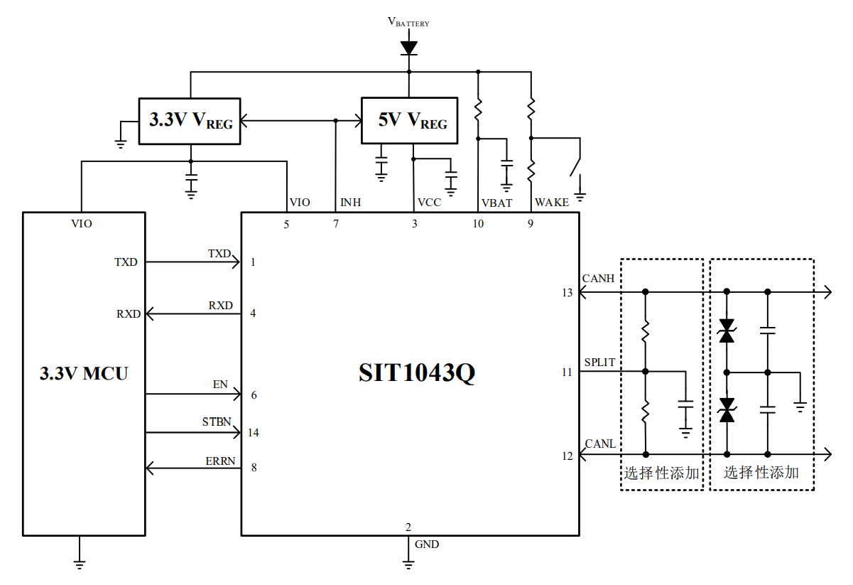 遠程喚醒:喚醒源來源于自身ECU節點所在的網絡報文,該節點可以處于完全睡眠狀態,一般無能量消耗。這種喚醒的特點:只有當CAN收發器監控到總線電平變化或者特定報文時,就會接通CAN芯片INH引腳控制LDO給到主控芯片上電,從而喚醒ECU節點。芯力特公司的SIT1043Q CAN收發器兼容以上兩種喚醒功能,下面我們來對SIT1043Q做個簡單的介紹。
