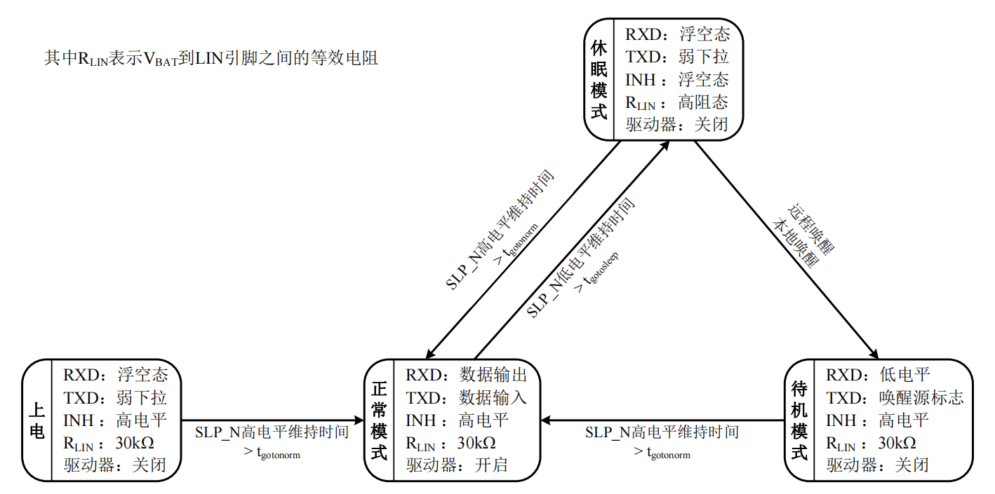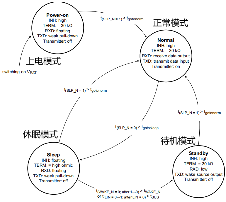 另外,SIT1021與TJA1021工作模式之間的切換一致,兩款收發(fā)器的工作模式之間的轉(zhuǎn)換示意圖如下: