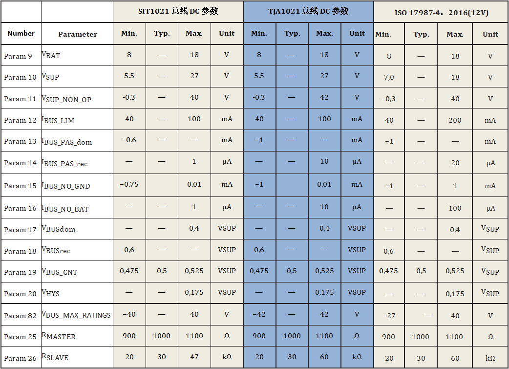 兩款LIN收發(fā)器的DC參數(shù)及AC參數(shù)均符合 LIN 2.0、LIN 2.1、LIN 2.2、LIN 2.2A、ISO 17987-4:2016 (12V) 和 SAE J2602 標(biāo)準(zhǔn),如下表: