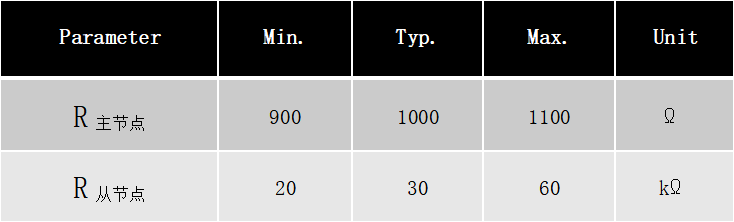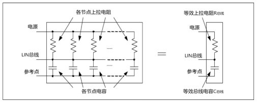 RC時間常數中R為總線上所有節點上拉電阻并聯的總阻值R總線,C為總線上所有的主從節點并聯電容及總的線電容之和即C總線 ,這個值限定在(1~10nF);如下: