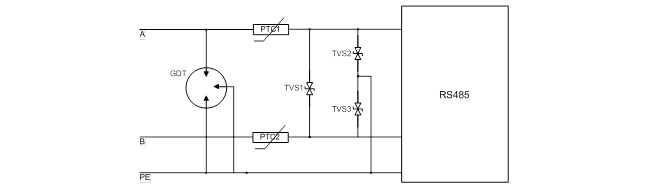 2, AB端口分別并聯TVS器件到保護地,AB之間并聯TVS器件,AB端口分別串聯熱敏電阻,并接氣體放電管到保護地形成三級保護的方案。